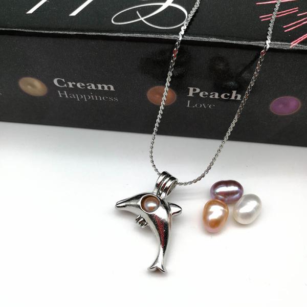****DIY Necklace Canned Oyster Love Pearl Included are :Wish Pearl with size 6-7mm in the Canned Oyster , Dolphin Shaped Cage Pendant ,normal copper Fishbone chain, one Dolphin Design Color Box and few Plastic Accessories .